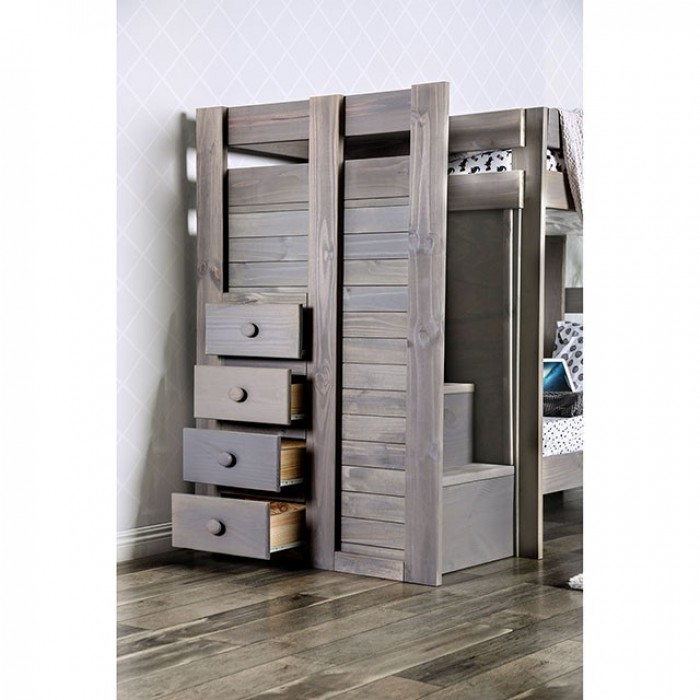 RusticGrayPine Wood, OthersPlank Style ConstructionFront Access StepsDrawers in Staircase13 Pc. Slats Top & BottomAmerican Pine ConstructionSlats Included