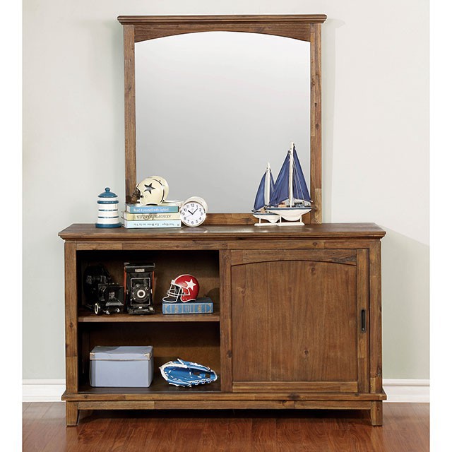 This great-looking bedroom set is perfect for a young child. The fabric upholstered headboard adds a touch of comfort and warmth to the bed’s simple design and the matching case goods’ straight lines add to the beauty of the set. The dresser has a unique sliding door, that helps bring variety to a classic design.