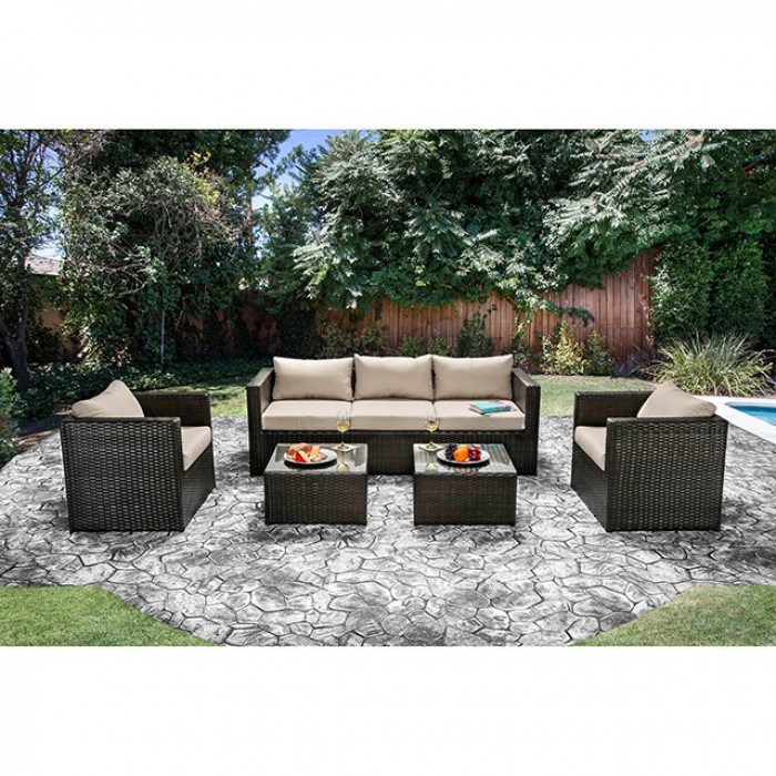 ContemporaryBeige, EspressoAluminum, Polyester, Faux Rattan, GlassContemporary StyleIncludes 2 TablesClear Tempered Glass TopIvory Fabric SeatsUv & Water ResistantEspresso Faux Wicker Frame